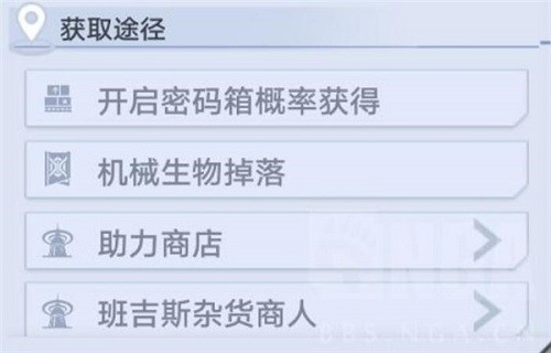 从官方显示的获取途径来看主要是四个,它们分别是开启密码箱概率获得、机械生物掉落、助力商店